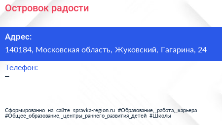 Островок радости по адресу 140184, Московская область, Жуковский, Гагарина, 24 в дальнейшем Организация, размещена в следующих категориях: