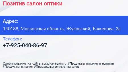 Позитив, салон оптики по адресу 140188, Московская область, Жуковский, Баженова, 2а в дальнейшем Организация, размещена в следующих категориях: