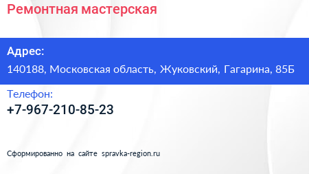 Ремонтная мастерская по адресу 140188, Московская область, Жуковский, Гагарина, 85Б в дальнейшем Организация, размещена в следующих категориях: