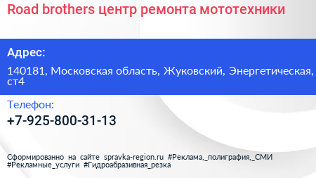 Road brothers, центр ремонта мототехники по адресу 140181, Московская область, Жуковский, Энергетическая, ст4 в дальнейшем Организация, размещена в следующих категориях: