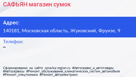 САФЬЯН, магазин сумок по адресу 140181, Московская область, Жуковский, Фрунзе, 9 в дальнейшем Организация, размещена в следующих категориях:
