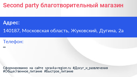 Second party, благотворительный магазин по адресу 140187, Московская область, Жуковский, Дугина, 2а в дальнейшем Организация, размещена в следующих категориях: