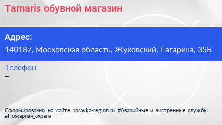 Tamaris, обувной магазин по адресу 140187, Московская область, Жуковский, Гагарина, 35Б в дальнейшем Организация, размещена в следующих категориях: