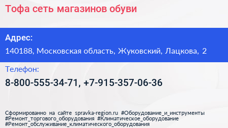 Тофа, сеть магазинов обуви по адресу 140188, Московская область, Жуковский, Лацкова, 2 в дальнейшем Организация, размещена в следующих категориях: