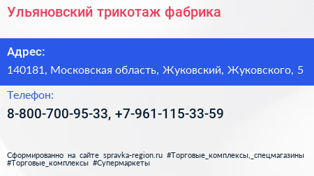 Ульяновский трикотаж, фабрика по адресу 140181, Московская область, Жуковский, Жуковского, 5 в дальнейшем Организация, размещена в следующих категориях: