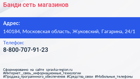Банди, сеть магазинов по адресу 140184, Московская область, Жуковский, Гагарина, 24/1 в дальнейшем Организация, размещена в следующих категориях:
