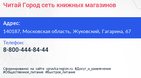 Читай-Город, сеть книжных магазинов по адресу 140187, Московская область, Жуковский, Гагарина, 67 в дальнейшем Организация, размещена в следующих категориях:
