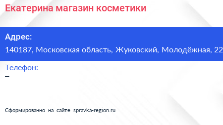 Екатерина, магазин косметики по адресу 140187, Московская область, Жуковский, Молодёжная, 22 в дальнейшем Организация, размещена в следующих категориях: