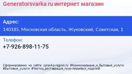 Generatorsvarka.ru, интернет-магазин по адресу 140185, Московская область, Жуковский, Советская, 1 в дальнейшем Организация, размещена в следующих категориях: