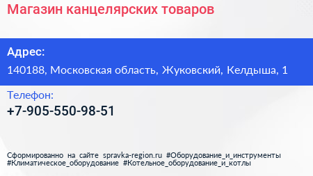 Магазин канцелярских товаров по адресу 140188, Московская область, Жуковский, Келдыша, 1 в дальнейшем Организация, размещена в следующих категориях: