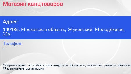 Магазин канцтоваров по адресу 140186, Московская область, Жуковский, Молодёжная, 21а в дальнейшем Организация, размещена в следующих категориях: