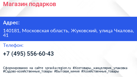 Магазин подарков по адресу 140181, Московская область, Жуковский, улица Чкалова, 41 в дальнейшем Организация, размещена в следующих категориях: