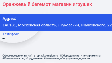 Оранжевый бегемот, магазин игрушек по адресу 140181, Московская область, Жуковский, Маяковского, 22 в дальнейшем Организация, размещена в следующих категориях: