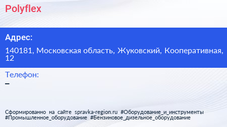 Polyflex по адресу 140181, Московская область, Жуковский, Кооперативная, 12 в дальнейшем Организация, размещена в следующих категориях: