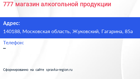 777, магазин алкогольной продукции по адресу 140188, Московская область, Жуковский, Гагарина, 85а в дальнейшем Организация, размещена в следующих категориях: