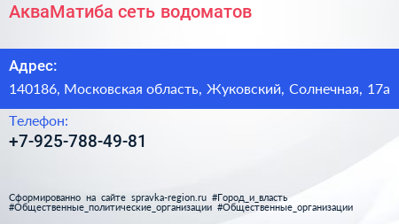 АкваМатиба, сеть водоматов по адресу 140186, Московская область, Жуковский, Солнечная, 17а в дальнейшем Организация, размещена в следующих категориях: