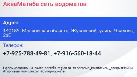 АкваМатиба, сеть водоматов по адресу 140185, Московская область, Жуковский, улица Чкалова, 2аЕ в дальнейшем Организация, размещена в следующих категориях: