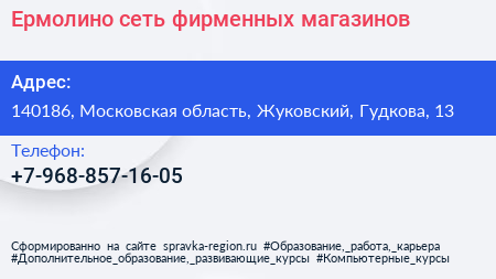 Ермолино, сеть фирменных магазинов по адресу 140186, Московская область, Жуковский, Гудкова, 13 в дальнейшем Организация, размещена в следующих категориях: