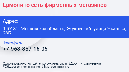 Ермолино, сеть фирменных магазинов по адресу 140181, Московская область, Жуковский, улица Чкалова, 28Б в дальнейшем Организация, размещена в следующих категориях:
