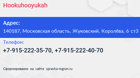 Hookuhooyukah по адресу 140187, Московская область, Жуковский, Королёва, 6 ст3 в дальнейшем Организация, размещена в следующих категориях: