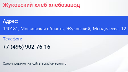 Жуковский хлеб, хлебозавод по адресу 140181, Московская область, Жуковский, Менделеева, 12 в дальнейшем Организация, размещена в следующих категориях: