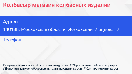 Колбасыр, магазин колбасных изделий по адресу 140188, Московская область, Жуковский, Лацкова, 2 в дальнейшем Организация, размещена в следующих категориях: