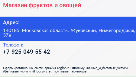 Магазин фруктов и овощей по адресу 140185, Московская область, Жуковский, Нижегородская, 37а в дальнейшем Организация, размещена в следующих категориях: