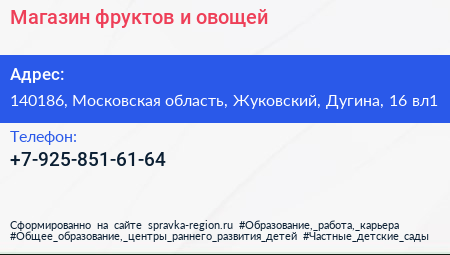 Магазин фруктов и овощей по адресу 140186, Московская область, Жуковский, Дугина, 16 вл1 в дальнейшем Организация, размещена в следующих категориях: