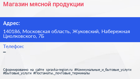 Магазин мясной продукции по адресу 140186, Московская область, Жуковский, Набережная Циолковского, 7Б в дальнейшем Организация, размещена в следующих категориях: