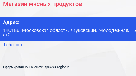 Магазин мясных продуктов по адресу 140186, Московская область, Жуковский, Молодёжная, 15 ст2 в дальнейшем Организация, размещена в следующих категориях: