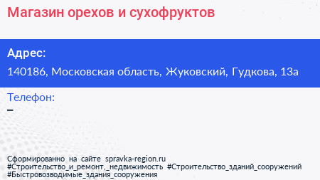 Магазин орехов и сухофруктов по адресу 140186, Московская область, Жуковский, Гудкова, 13а в дальнейшем Организация, размещена в следующих категориях: