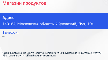 Магазин продуктов по адресу 140184, Московская область, Жуковский, Луч, 10а в дальнейшем Организация, размещена в следующих категориях: