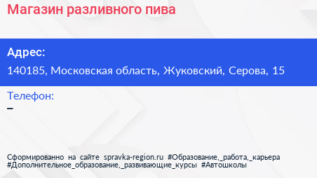 Магазин разливного пива по адресу 140185, Московская область, Жуковский, Серова, 15 в дальнейшем Организация, размещена в следующих категориях: