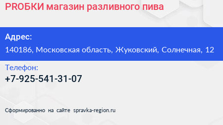 #PRОБКИ, магазин разливного пива по адресу 140186, Московская область, Жуковский, Солнечная, 12 в дальнейшем Организация, размещена в следующих категориях: