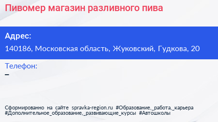 Пивомер, магазин разливного пива по адресу 140186, Московская область, Жуковский, Гудкова, 20 в дальнейшем Организация, размещена в следующих категориях:
