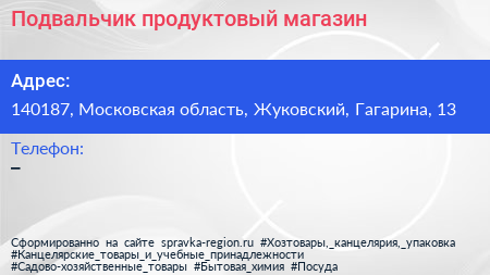 Подвальчик, продуктовый магазин по адресу 140187, Московская область, Жуковский, Гагарина, 13 в дальнейшем Организация, размещена в следующих категориях: