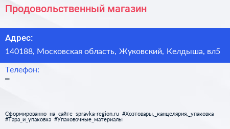 Продовольственный магазин по адресу 140188, Московская область, Жуковский, Келдыша, вл5 в дальнейшем Организация, размещена в следующих категориях: