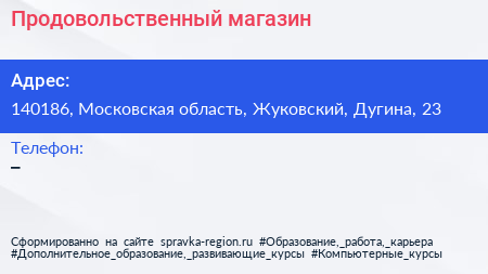 Продовольственный магазин по адресу 140186, Московская область, Жуковский, Дугина, 23 в дальнейшем Организация, размещена в следующих категориях: