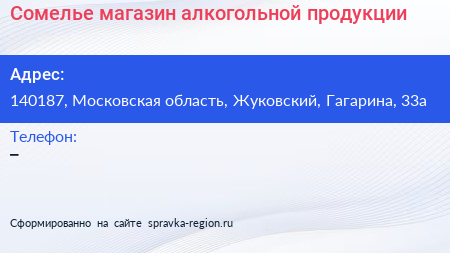 Сомелье, магазин алкогольной продукции по адресу 140187, Московская область, Жуковский, Гагарина, 33а в дальнейшем Организация, размещена в следующих категориях: