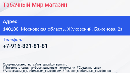 Табачный Мир, магазин по адресу 140188, Московская область, Жуковский, Баженова, 2а в дальнейшем Организация, размещена в следующих категориях: