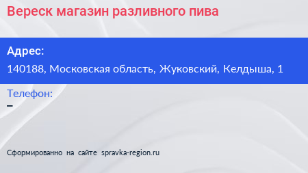Вереск, магазин разливного пива по адресу 140188, Московская область, Жуковский, Келдыша, 1 в дальнейшем Организация, размещена в следующих категориях: