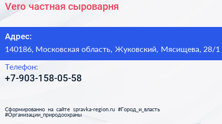 Vero, частная сыроварня по адресу 140186, Московская область, Жуковский, Мясищева, 28/1 в дальнейшем Организация, размещена в следующих категориях:
