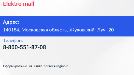 Elektro-mall по адресу 140184, Московская область, Жуковский, Луч, 20 в дальнейшем Организация, размещена в следующих категориях: