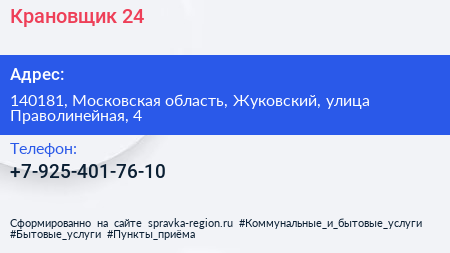 Крановщик 24 по адресу 140181, Московская область, Жуковский, улица Праволинейная, 4 в дальнейшем Организация, размещена в следующих категориях: