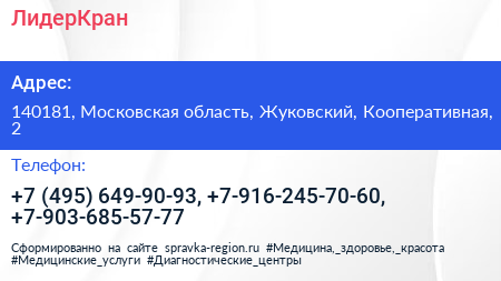 ЛидерКран по адресу 140181, Московская область, Жуковский, Кооперативная, 2 в дальнейшем Организация, размещена в следующих категориях: