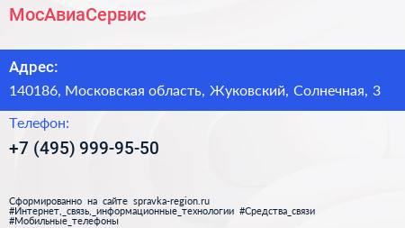 МосАвиаСервис по адресу 140186, Московская область, Жуковский, Солнечная, 3 в дальнейшем Организация, размещена в следующих категориях:
