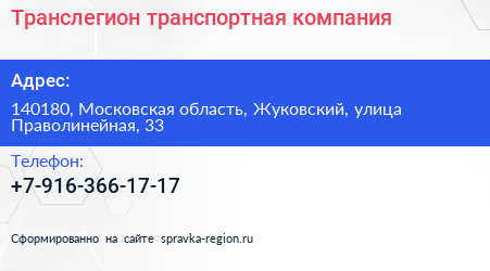 Транслегион, транспортная компания по адресу 140180, Московская область, Жуковский, улица Праволинейная, 33 в дальнейшем Организация, размещена в следующих категориях: