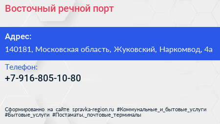 Восточный речной порт по адресу 140181, Московская область, Жуковский, Наркомвод, 4а в дальнейшем Организация, размещена в следующих категориях: