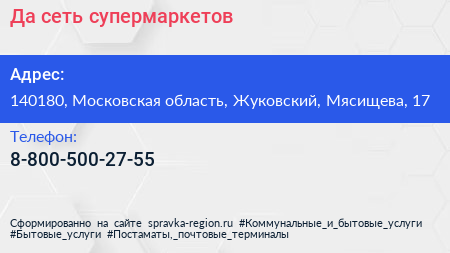 Да!, сеть супермаркетов по адресу 140180, Московская область, Жуковский, Мясищева, 17 в дальнейшем Организация, размещена в следующих категориях: