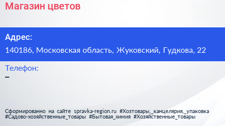 Магазин цветов по адресу 140186, Московская область, Жуковский, Гудкова, 22 в дальнейшем Организация, размещена в следующих категориях: